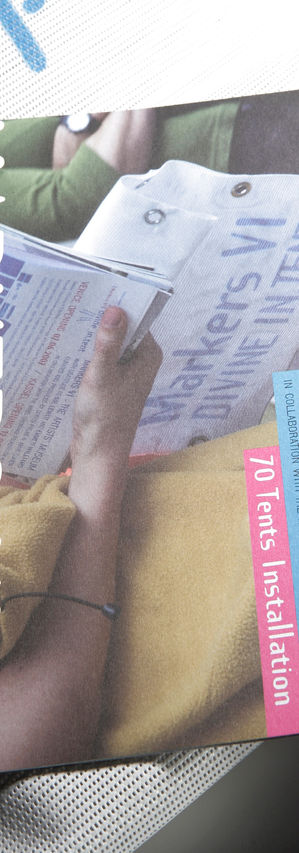 The catalog and the case are designed from the materials of the tents; Industrial mesh, metal rings and thick uncoated paper - as a minimalist kit in blue and white. The kit included a poster, flyers, art works and curator text, as well as additional contributors essays booklets.
